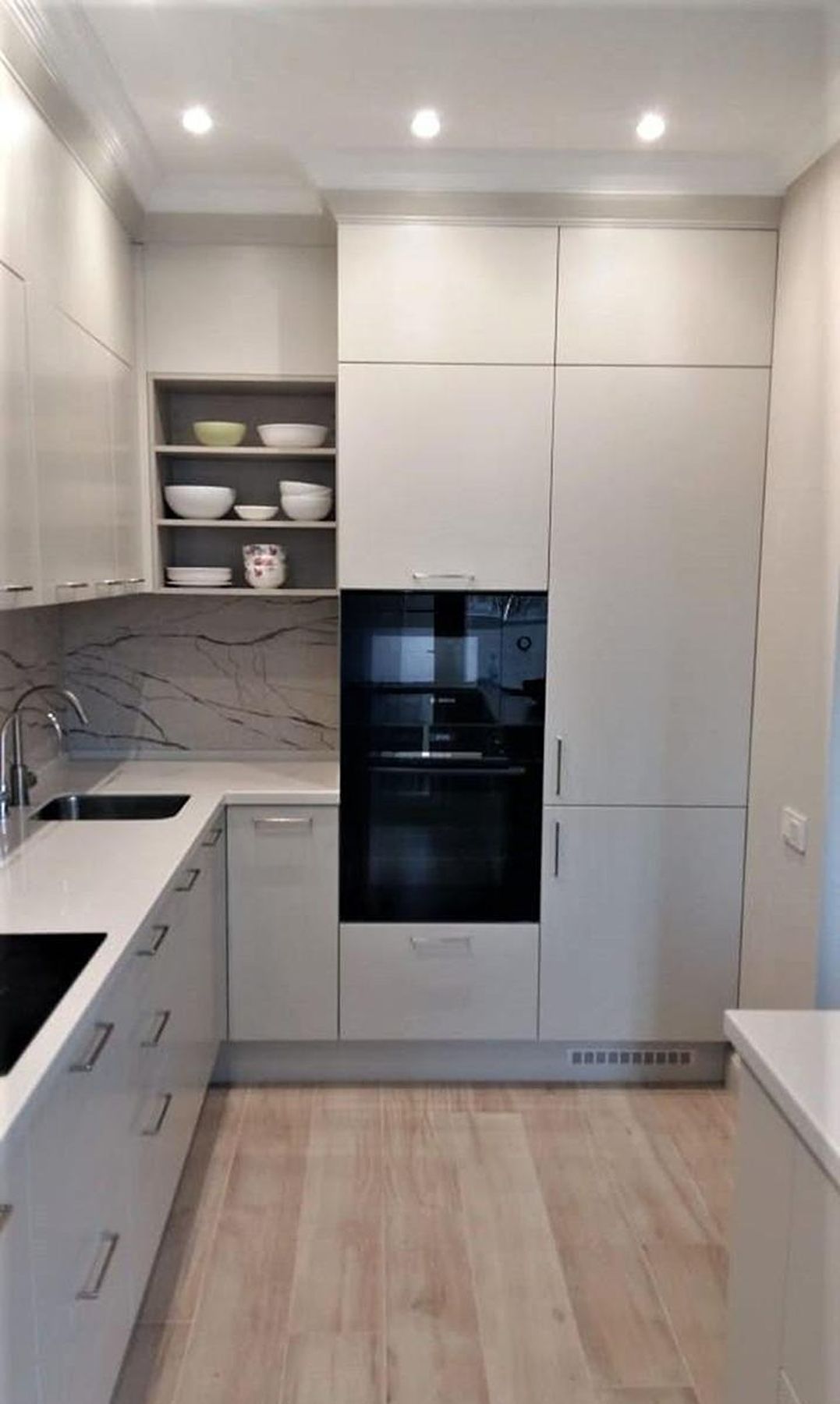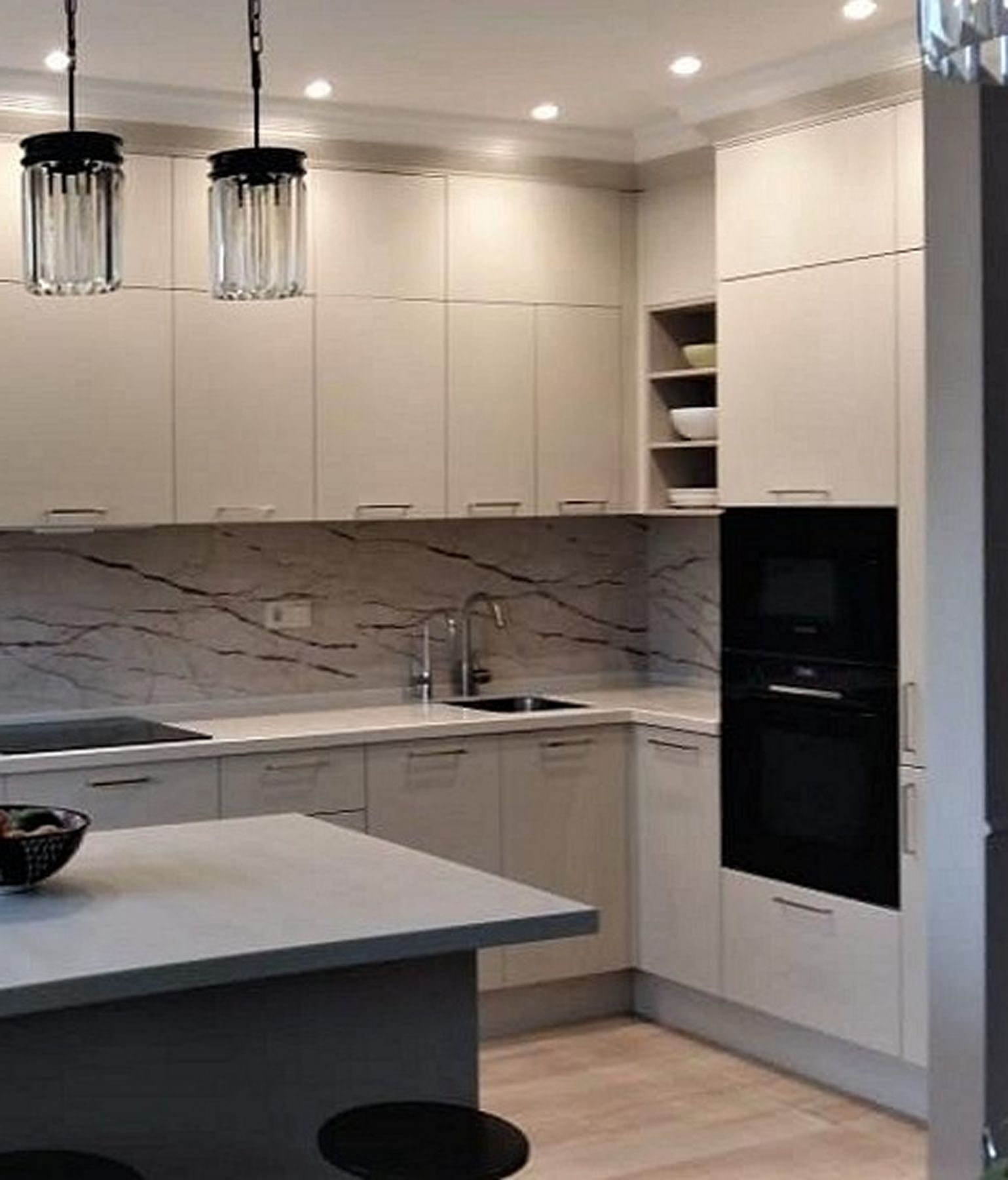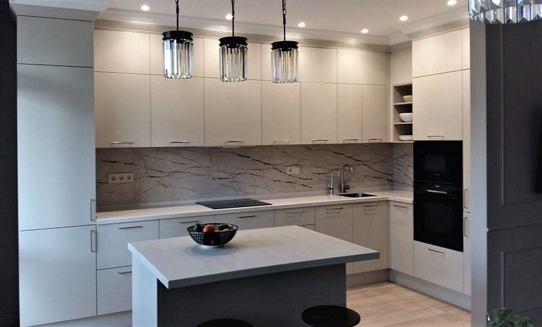 О проектеОписаниеЗадачей этого проекта было создать не просто гарнитур, а гармоничную часть интерьера. Ключевой идеей стала полная интеграция кухни в пространство за счет точного совпадения цвета фасадов и стен.